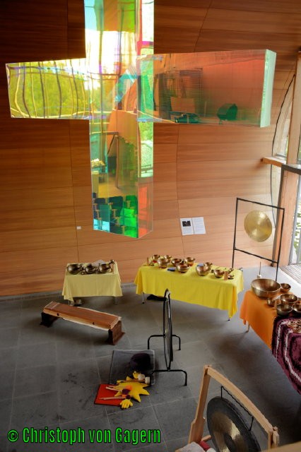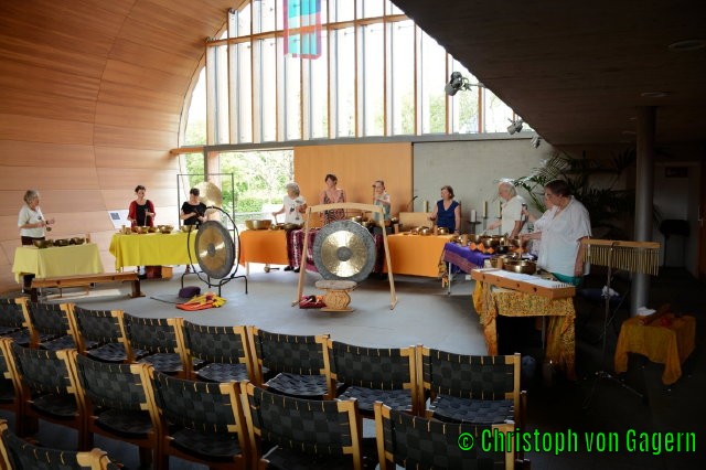 Mit viel Freude und Engagement waren insgesamt zehn Spieler*innen dabei und haben während des Nachmittags den Ablauf nach einem Konzept von Katharina von Gagern erarbeitet. Die Idee war, mit den Klängen von Klangschalen, TamTam und Fen Gongs, Monochorden, Klangspielen, Klangkugeln und Zimbeln die Qualität der Kapelle als Ort der Verabschiedung zum Ausdruck zu bringen.